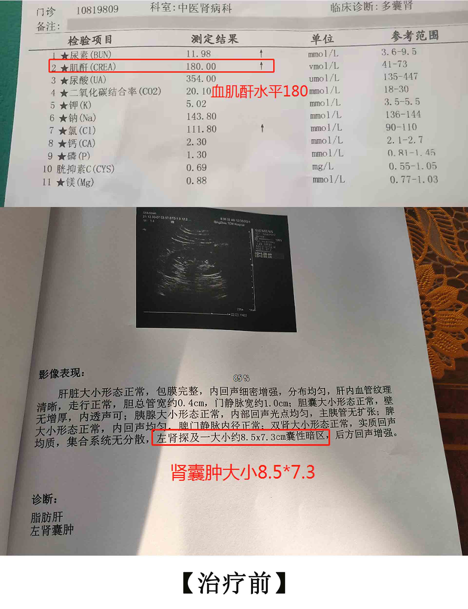 我跟家里人商量了之后决定去专家那治疗试试,在专家那治疗了一个多月后,囊肿小了很多,血肌酐水平也降下来了。 身体也感觉特别舒服!这时我们两口子算是真正的放心了,我真的打心里感谢这位专家!
